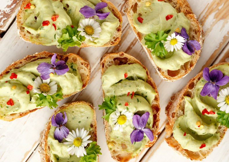Crostini primavera con hummus di avocado