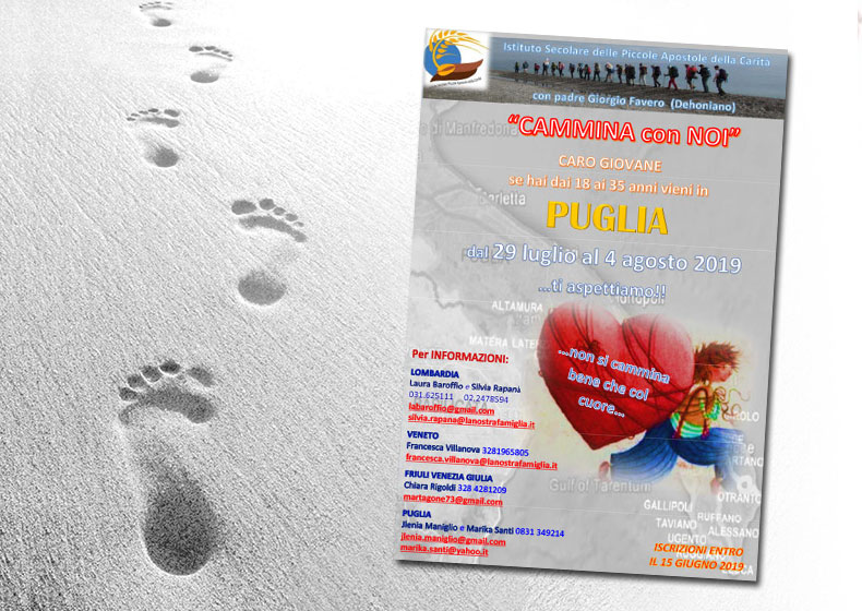 Il Cammino è organizzato dalle Piccole Apostole della Carità insieme a Padre Giorgio Favero e promosso dal Gruppo Controcorrente interno a La Nostra Famiglia, che si rivolge soprattutto ai giovani volontari che prestano servizio presso l’associazione ma aperto a tutti.