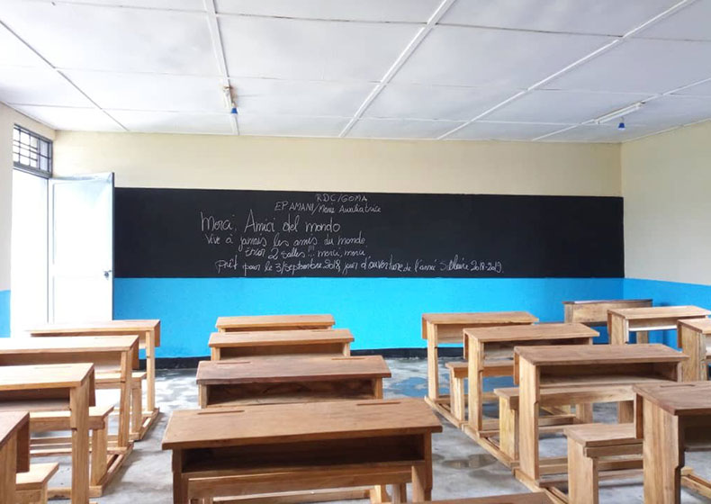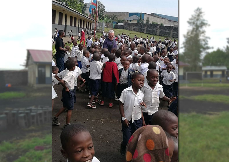 La mattina appresso, all’EP Amani Maria Ausiliatrice, una miriade di teste scure, accuratamente rasate, appoggiate su corpi fasciati di bianco e di blu, snelli e scattanti, cantano a squarciagola l’inno congolese e poi… tante mani e tanti occhi: mani che ti salutano, mani che ti accarezzano; occhi che ti sorridono, occhi spalancati che ti fissano, occhi e sguardi che timidamente si abbassano e serenamente ti dicono “Bonjour monsieur Renato”. E tu, in quel momento, li vorresti salutare tutti, abbracciare tutti, accarezzare tutti, almeno guardarli tutti e sorridere a tutti. Adrenalina pura ed emozione unica! Groppo in gola e commozione incredibile! La marea di cioccolato rientra velocemente in classe ed io, approfittando di un cielo terso e di una temperatura favorevole, mi lancio sulla strada agganciando il primo “motard” che passa. Sono fortunato: apprendo durante il tragitto che il mio conducente ha frequentato le scuole superiori, ha conseguito il diploma di insegnante e parla bene inglese e francese; non trovando lavoro, ha fatto di necessità virtù, e sbarca il lunario facendo il tassista in moto. Per dieci dollari mi porta in lungo e in largo per tutta la città. Mi fa vedere la nuova cattedrale ancora in fase di costruzione, enorme e imponente, con strutture in ferro e acciaio che arrivano a sfiorare il cielo. Assomiglia nella sua forma ancora embrionale alla Torre Eiffel con al posto della Senna il fiume che la lambisce in terra francese, una moltitudine di baracche in legno e lamiera a farle da contorno e da contrasto. Poi è la volta de “Le marché de Kituku”, situato nella zona nord occidentale di Goma e provvisto anche di un piccolo porto dove attraccano parecchi battelli provenienti da Bukavu, città situata dalla parte opposta del lago Kivu. Un enorme mercato formato da tetre strutture fisse che accolgono al proprio interno una moltitudine di venditori e compratori. Qui commerciano anche carne fresca proveniente da un enorme macello costruito nelle vicinanze: lunghi banconi di legno ricoperti di sangue ed interiora dove una decina di donne dai grezzi grembiuli di cuoio scuro squartano grossi pezzi di animali (perlopiù mucche e capre), rendendoli appetibili alla comunità in attesa, il tutto tra nugoli di mosche ed al sordo rintocco dei colpi di “machete”. Una scena apocalittica e impressionante che farò fatica a dimenticare. Anche qui sento gli occhi di tutti puntati su di me, non per una sorta di astio verso lo straniero ma piuttosto per la sorpresa e la curiosità del primo bianco che, con completa naturalezza, si mischia tra di loro.