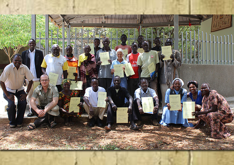 In foto: Marco Steffan con il Comitato di Pace e Giustizia della Parrocchia di Naoi, Diocesi di Moroto.