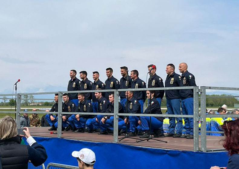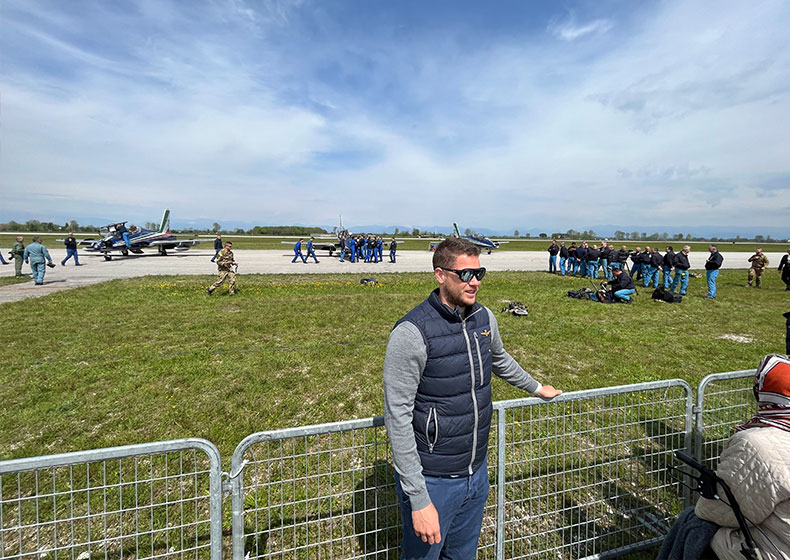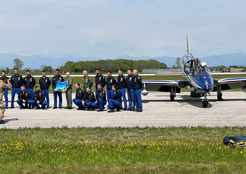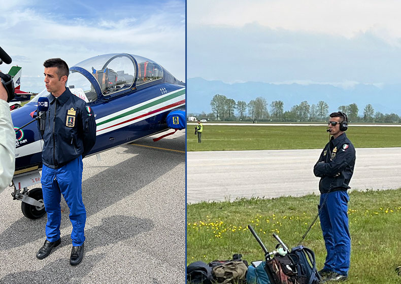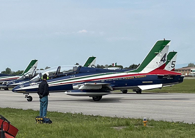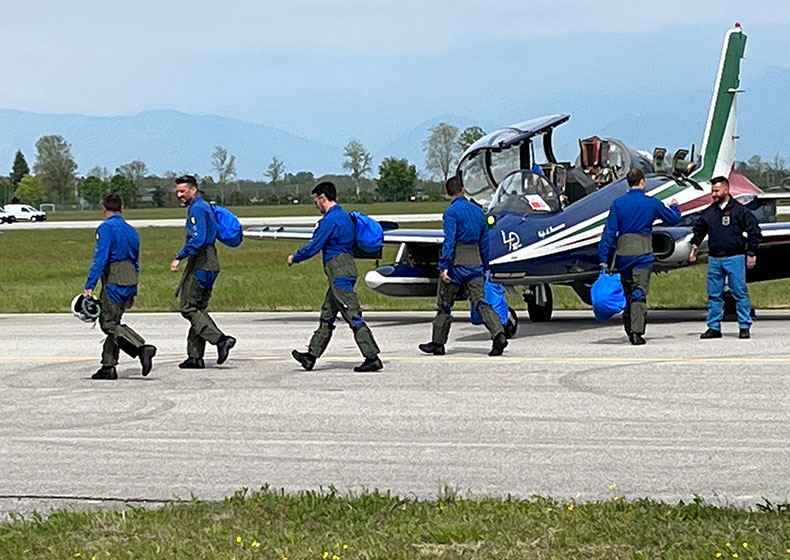 Naturalmente accettiamo, e il primo maggio ci ritroviamo catapultati all’interno della Base Militare di Rivolto (UD), campo base delle Frecce Tricolori, ad una ventina di metri dai velivoli Aermacchi 339 in uso alla pattuglia.