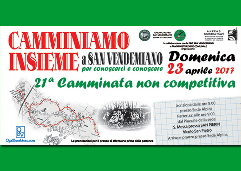 Domenica 23 aprile 2017 A.F.F.A.S. SINISTRA PIAVE e GRUPPO ALPINI SAN VENDEMIANO organizzano la 21a Camminata non competitiva che punta a coinvolgere ragazzi, famiglie, disabili, autorità... insieme per stabilire contatti umani reali, conoscersi e conoscere il territorio attraverso un'osservazione attenta del suo paesaggio che, molto spesso, di fretta trascuriamo.