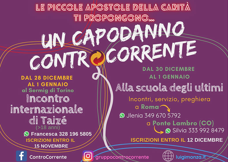 Quest’anno la proposta delle Piccole Apostole della Carità per vivere un Capodanno Controcorrente si sdoppia: dal 28 dicembre al 1 gennaio Incontro internazionale di Taizé al Sermig di Torino – Arsenale della Pace, una realtà ricca che si spende per i poveri e i diritti delle persone e che accoglie sempre molti ragazzi e ragazze che vogliono fare un'esperienza di servizio, condivisione e spiritualità (iscrizioni entro il 30 novembre a Francesca: 328-1965805); dal 30 dicembre al 1 gennaio Alla scuola degli ultimi a Roma (iscrizioni entro il 12 dicembre a Jlenia: 349-6705792) o a Ponte Lambro (Co) (iscrizioni entro il 12 dicembre a Silvia: 333-9928479).