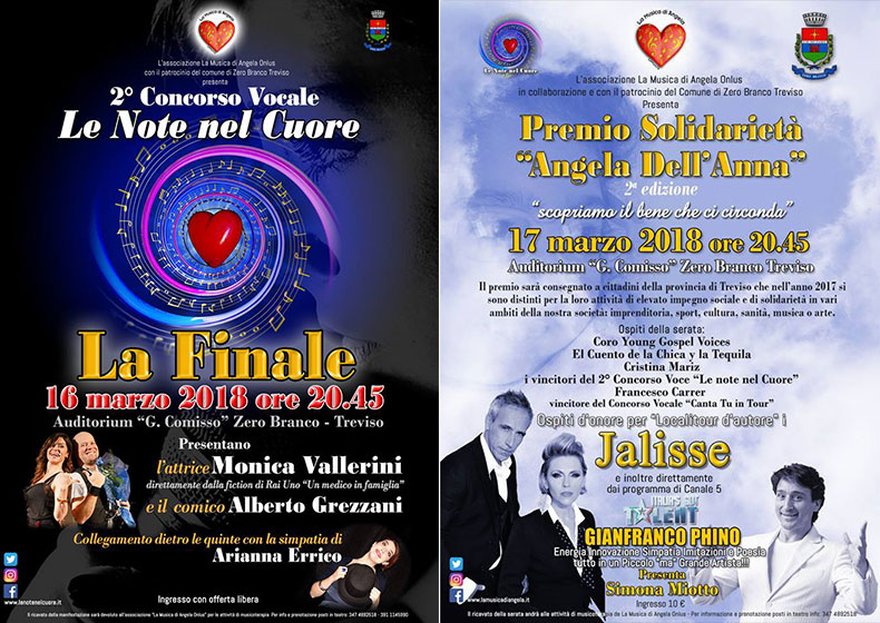 Sabato 18 marzo, infatti, sempre alle ore 20.45 nell’Auditorium G. Comisso verrà assegnato il Premio di Solidarietà “Angela Dell’Anna” a 5 figure - tra singoli cittadini e associazioni della provincia di Treviso - che si sono distinte per opere e progetti solidali. I gesti gratuiti di altruismo non balzano agli onori della cronaca, eppure, ogni giorno, tante persone si prodigano silenziosamente per il bene nei vari ambiti del sociale; ci vogliono occhi e cuore per riconoscerlo! E bisogna parlarne, così da portare soprattutto alle giovani generazioni esempi positivi. Ospiti d’onore della serata saranno i Jalisse e direttamente da Italia’s Got Talent Gianfranco Phino. Non mancherà la musica con le esibizioni dei vincitori del Concorso Le Note nel Cuore e molti altri ospiti. Presenta Simona Miotto.