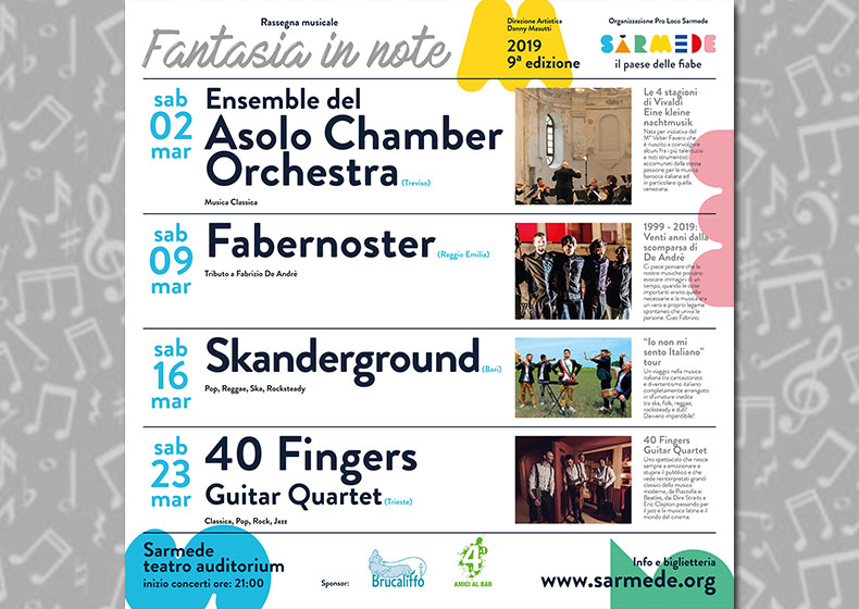 Fresca e frizzante rassegna musicale all’insegna della varietà di proposte e di generi per tutti i gusti: è Fantasia in note, ideata dalla Pro Loco di Sarmede e giunta quest’anno alla sua nona edizione. La rassegna si propone all’interno di un teatro-auditorium nato con la massima attenzione per l’acustica e per la versatilità della neo struttura. Nei quattro sabati di marzo, si alterneranno sul palco del teatro-auditorium di Sarmede (Via Giuseppe Mazzini, 16) gruppi musicali diversi: