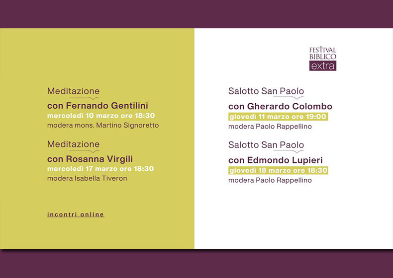 - mercoledì 17 marzo ore 18:30 |"La vita dell'uno è legata alla vita dell'altro" (Gen 44,30). Non c'è giustizia senza fraternità con Rosanna Virgili (biblista), modera Isabella Tiveron. Meditazione organizzata dalla sede di Padova del Festival Biblico.