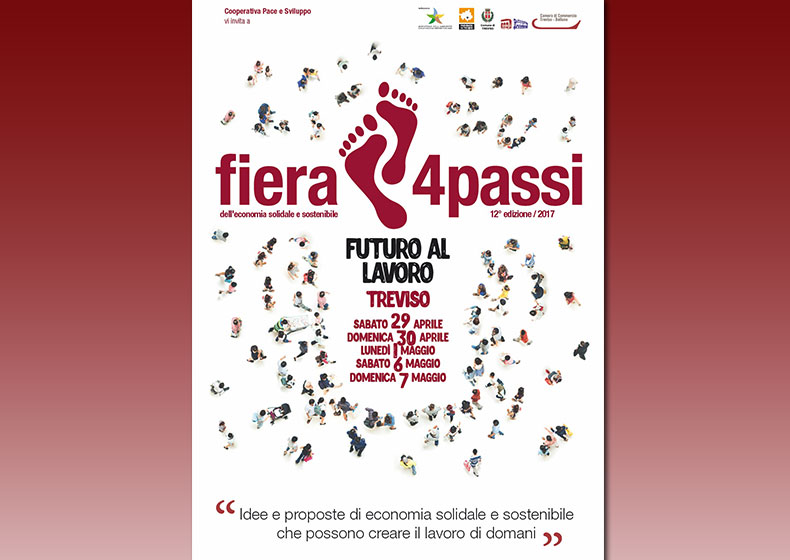 “Futuro al lavoro” è il tema scelto per la XII edizione della Fiera4passi, organizzata dalla Cooperativa Pace e Sviluppo di Treviso (prima organizzazione di commercio equo e solidale in Veneto per attività, fatturato e numero di volontari e terza in Italia) al parco Sant’Artemio - sede della Provincia di Treviso - nei giorni 29 e 30 aprile, 1 maggio e 6 e 7 maggio 2017.