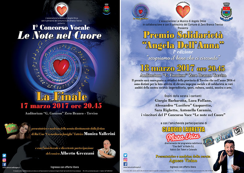 La sera successiva… un altro evento dedicato alla solidarietà! In collaborazione con il Comune di Zero Branco, “La Musica di Angela” ONLUS quest’anno ha istituito anche il Premio Solidarietà “Angela Dall’Anna”, rivolto ai cittadini della provincia di Treviso che si sono distinti per gesti (gratuiti) di solidarietà nell’anno 2016. Lo scopo, come recita il sottotitolo dell’evento, è scoprire il bene che ci circonda: spesso le opere buone non balzano agli onori della cronaca, eppure, ogni giorno, tante persone si prodigano silenziosamente per il bene nei vari ambiti del sociale; ci vogliono occhi e cuore per riconoscerlo! Sempre nella meravigliosa cornice di Villa Guidini a Zero Branco (TV), sabato 18 marzo, dalle ore 20.45, verranno premiati 6 cittadini della provincia di Treviso che si sono distinti per opere buone. Sarà una serata ricca di emozioni. Non mancheranno la musica, con le esibizioni dei finalisti del 1° Concorso Vocale “Le Note nel Cuore”, e le risate, grazie all’amichevole partecipazione di Claudio Lauretta, “Mister Voice”, direttamente dal programma radiofonico “Ciao Belli” di Radio DJ, Italia’s got Talent e Colorato. Presentatrice e madrina della serata sarà la giornalista Agnese Vicino.