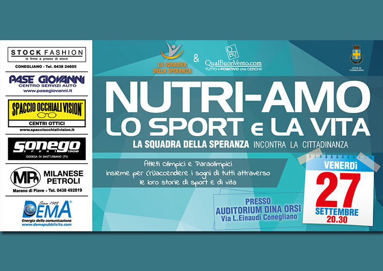 Venerdì 27 settembre alle ore 20.30 il Teatro Dina Orsi di Conegliano accoglierà La Squadra della Speranza, un gruppo di atleti (professionisti e non) che s’impegna a portare il messaggio positivo dello sport come costruzione di vita e di realizzazione dei propri sogni. “Con le nostre piccole esperienze di sport, diamo grande forza a chi lotta ogni giorno per la medaglia d’oro della vita” dice Daniele Molmenti, campione olimpico di kayak (Londra, 2012) fondatore de La Squadra della Speranza insieme a Michele Chinellato.