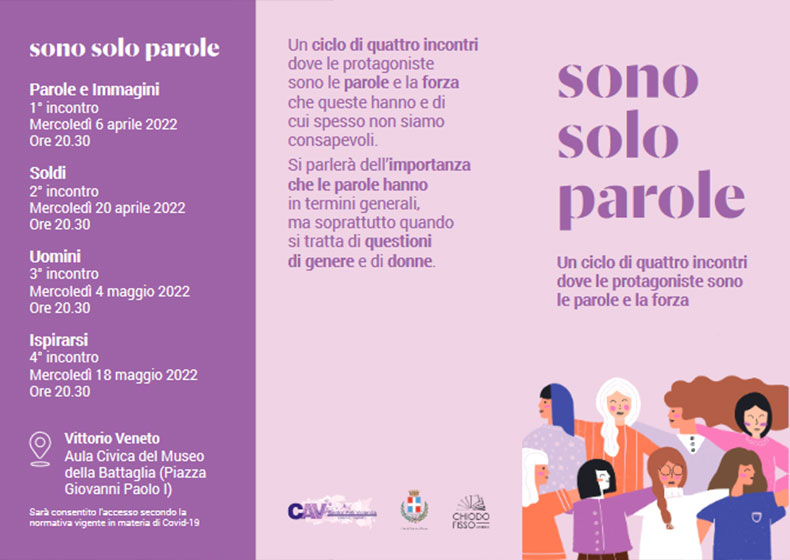 “Sono Solo Parole” è il titolo che il Centro Anti Violenza di Vittorio Veneto ha scelto per il ciclo di incontri che andranno in scena a partire da mercoledì 6 aprile presso l’Aula Civica del Museo della Battaglia di Vittorio Veneto (TV).