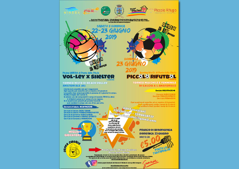 Ritornano i tornei di beach volley (Volley X Shelter) e di calcio a 5 (Piccolo Rifutbol) pensati per regalare alle persone disabili ospiti del Piccolo Rifugio di Ponte della Priula l’opportunità di trascorrete alcuni giorni ad Assisi. Le squadre che nei giorni 22 e 23 giugno parteciperanno ai tornei concorreranno a questo sogno.