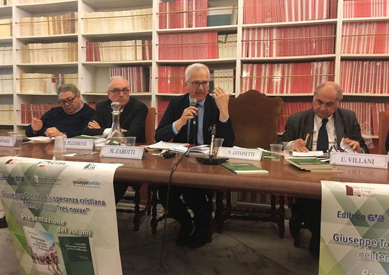 «Un grande onore, e un sentimento di profonda gratitudine». Con queste parole il direttore scientifico e vice presidente dell’Istituto Diocesano “Beato Toniolo. Le vie dei Santi”, Marco Zabotti, ha esordito parlando a Roma alla presentazione del suo volume “Giuseppe Toniolo. Nella storia il futuro”, pubblicato dall’Editrice AVE, durante l’evento “Giuseppe Toniolo, la speranza cristiana nel tempo delle “res novae” ospitato nella prestigiosa sede dell’Istituto Luigi Sturzo, tra i più importanti centri di archivio, documentazione e cultura della storia del movimento cattolico in Italia. Diversi e qualificati i soggetti che hanno collaborato per l’organizzazione dell’incontro pubblico nella Capitale, durante il quale è stato anche illustrato ai numerosi partecipanti il volume ”L’attualità di Giuseppe Toniolo nel Terzo Millennio”, coautori Vincenzo Conso e Ludovico Ferro: Istituto Sturzo, Fai Cisl, Fai Cisl Studi e Ricerche, Editrice AVE, Istituto “Beato Toniolo” della diocesi vittoriese e Istituto di diritto internazionale della pace “Giuseppe Toniolo”, che ha sede presso l’Azione Cattolica Italiana.