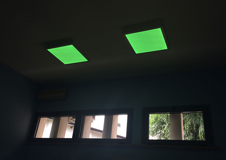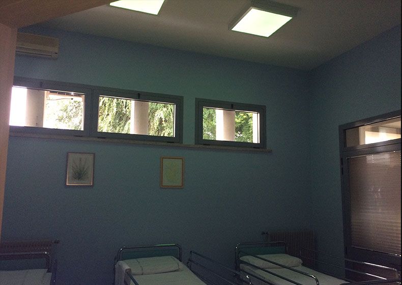 Oltre all’angolo morbido e luminoso della palestra, l’intervento di miglioria comprende anche la stanza dove ci sono i letti: le vecchie asettiche lampade al neon sono state sostituite con dei pannelli a led dove si formano giochi di luce e di colore che aiutano i ragazzi a rilassarsi.