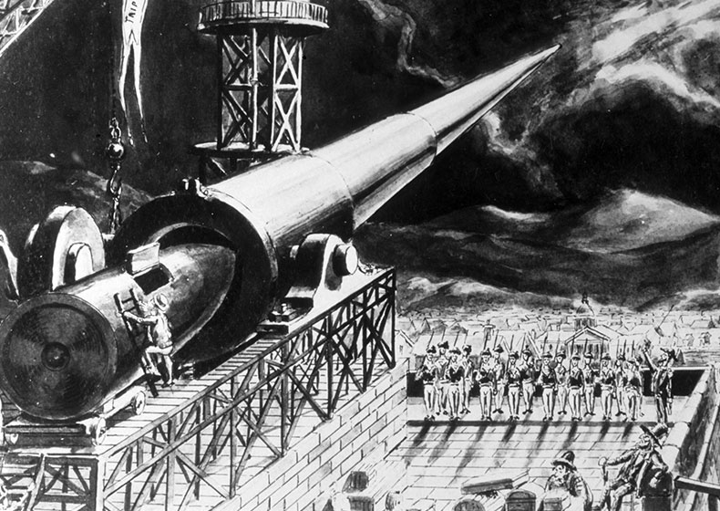 La navicella viene sapientemente lavorata da bravi fabbri e maniscalchi, nel frattempo i prescelti per il viaggio salgono su di un terrazzo, da dove intravedono i tetti della città e le colate di metallo fuso della navicella. È tutto pronto per il lancio: i viaggiatori entrano nella navicella-proiettile, subito immessa nel cannone chilometrico e puntato direttamente sulla Luna, rapidamente si abbassa la mano dell’ufficiale: l’artificiere spara e, lentamente, la Luna si avvicina sempre più, tanto che il proiettile si conficcherà nel suo occhio (forse il fotogramma più famoso della storia del cinema).