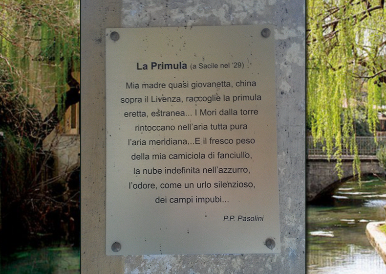 Questo Pasolini mi si è figurato per la prima volta nella mente percorrendo la via che conduce al Duomo di Sacile e leggendo le targhe commemorative che la Pro loco di Sacile ha affisso di recente, accogliendo e realizzando un'idea della professoressa Liviana Covre. Dalle targhe, affiorano episodi, gesti, valori, emozioni di un Pasolini per lo più inedito, che meritano di essere ricordati ed onorati, poiché egli - straordinario genio artistico - onorò la nostra terra vivendola, amandola e celebrandola in versi.