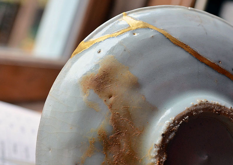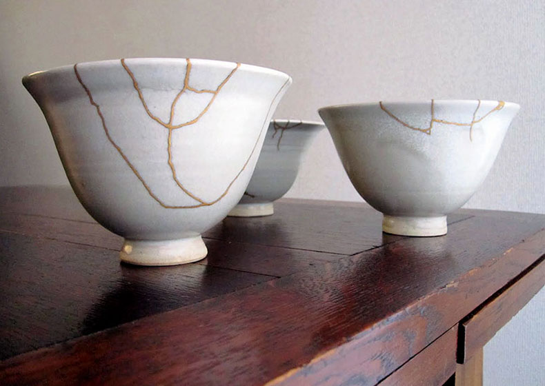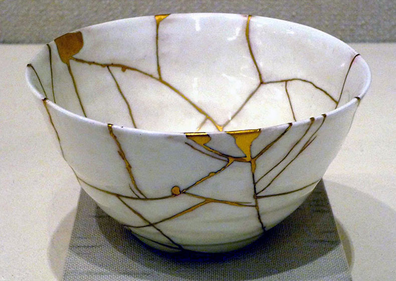 L’arte di abbracciare il danno, di non vergognarsi delle ferite, è la delicata lezione simbolica suggerita dall’antica arte giapponese del kintsugi che significa letteralmente "oro"("kin")e "riunire", "riparare", "ricongiungere" ("tsugi"). Quest’arte giapponese prescrive l’uso di un metallo prezioso – che può essere oro o argento liquido o lacca con polvere d’oro – per riunire i pezzi di un oggetto di ceramica rotto, esaltando le nuove nervature create, che diventano cicatrici impreziosite, bellezza da esibire. Ogni pezzo riparato così diviene unico e irripetibile, per via della casualità con cui la ceramica si frantuma e delle irregolari, ramificate decorazioni che si formano e che vengono esaltate dal metallo.