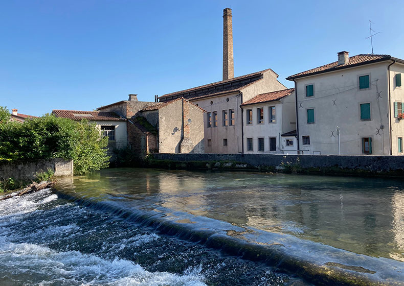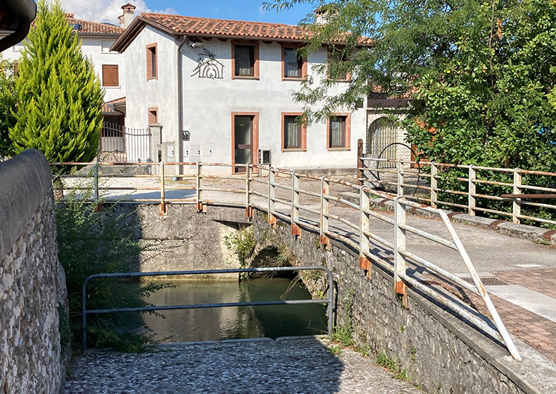 La passeggiata continua superando la bella piazzetta ed imboccando via Damiano Chiesa. Curiosando a destra e sinistra, si potranno notare delle costruzioni secolari che potrebbero raccontare storie vincolate alle acque del Meschio e ai suoi mulini. Già a metà della piccola via, sulla destra, in corrispondenza di una passerella in legno, si possono vedere le bocche di uscita di un vecchio mulino che ancora separa le acque del Meschio dando vita a un canale secondario. Sul lato opposto della strada il fabbricato di una vecchia filanda conferma che questo era un borgo vivace e ricco di opifici. Ancora poche decine di metri e proprio dal ponte sul Meschio si potrà capire come potevano essere separate le acque per alimentare i mulini presenti nel borgo e godere del bel panorama che dal borgo spazia fino alle montagne.