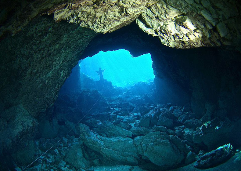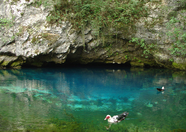 Le acque della sorgente riappaiono in superficie dopo un lungo e tortuoso percorso nelle cavità della roccia lontane dall’occhio umano. Diversi sono stati i sub che, nel corso degli anni, si sono cimentati in spedizioni in immersioni per comprendere e scoprire la natura intricata e del sotterraneo della sorgente sotto il livello zero. Ad oggi il subacqueo Luigi Casati è riuscito a percorrere 212 metri in profondità stabilendo il record di immersione in questo luogo. Tale record è tuttora imbattuto. Gran parte della cavità è ancora da esplorare e da studiare. Molti sono ancora i cunicoli presenti e pericolosi in sede di esplorazione che il tempo e l’acqua hanno scavato nella roccia carsica, creando un labirinto aggrovigliato e misterioso.