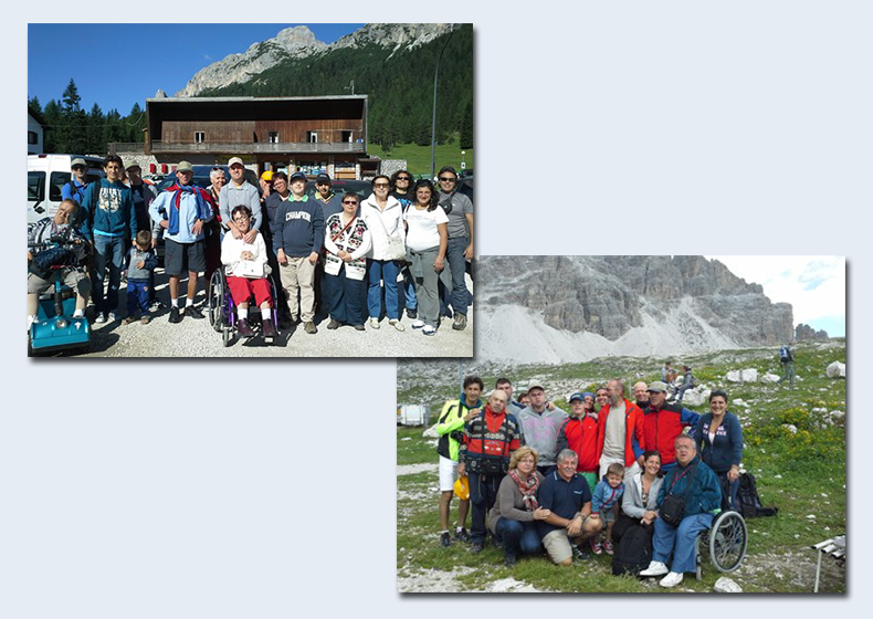 Foto delle vacanze estive ad Auronzo, trascorse dai volontari con gli ospiti del Piccolo Rifugio e con altre persone con disabilità