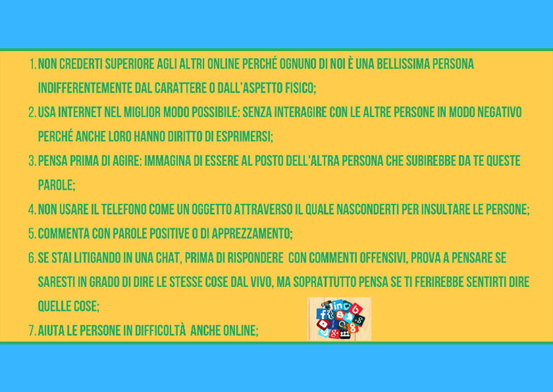 Ma il messaggio più importante, sostenuto dai ragazzi e dalle ragazze del CCR, è di non dimenticare che quello che ci succede online è strettamente connesso alla nostra vita reale, e ci riguarda tutti. Per questo è importante avere il coraggio di essere sempre se stessi e scegliere consapevolmente le proprie azioni nella vita reale tanto quanto in quella virtuale, poiché esse coincidono. Così, la prima regola è Non crederti superiore agli altri online, perché ognuno di noi è una bellissima persona indifferentemente dal carattere o dall’aspetto fisico. Per loro è fondamentale sottolineare come il problema non sia internet ma come si decide di utilizzarlo, come indicato in una delle regole del manifesto: Usa internet per arricchirti sia moralmente che mentalmente.