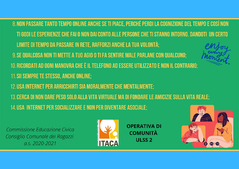 I ragazzi e le ragazze del CCR - guidati e accompagnati dall’operatrice di comunità della Cooperativa Itaca in tutto il percorso di ideazione, realizzazione e acquisizione delle competenze chiave in termini di cittadinanza digitale - hanno così raccolto più di 600 consigli dai loro coetanei, li hanno analizzati e discussi, dopo di che ne hanno scelti alcuni, considerati i più importanti, che sono diventati 14 indicazioni per un comportamento corretto, riportate nel “Manifesto della Gentilezza Online”. Il Manifesto, già pubblicato sul sito web del Comune di San Vendemiano e del locale Istituto comprensivo, verrà promosso e condiviso con tutta la comunità grazie anche al sostegno dell’Amministrazione comunale.