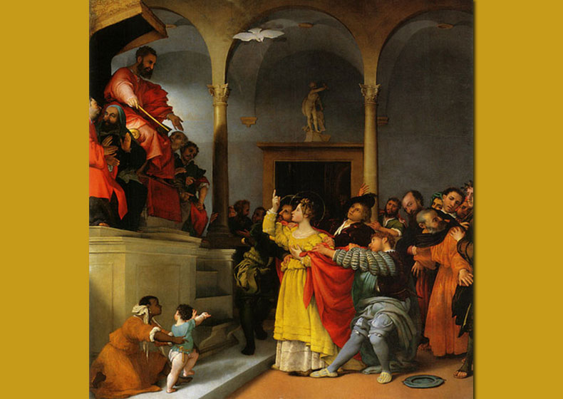 Pascasio, il prefetto, sapendo che era nobile, ricca e vedendola così bella, dapprima la trattò con gentilezza. Ma a mano a mano che il processo procedeva era chiaro che Lucia non avrebbe rinunciato alla sua fede cristiana. Pascasio ordinò che fosse trascinata in un luogo di perdizione e cominciò la persecuzione in base agli editti dell’imperatore Diocleziano. Fu allora che avvenne un prodigio: lo Spirito Santo fece in modo che Lucia fosse inamovibile. Provarono a trascinarla i più forti soldati, provarono a legarla mani e piedi e a tirare tutti insieme, alla fine si tentò anche con un paio di buoi: ma nulla. La ragazza restava dov’era! Il prefetto arrabbiatissimo e convinto che il prodigio potesse essere solo opera di una strega, ordinò che fosse arsa viva sul posto. Ma le fiamme non ebbero presa sulle vesti e sulla persona di Lucia. Alla fine, accecato dalla rabbia, Pascasio fece uccidere Lucia con un pugnale. Prima di morire, con le sue ultime parole, la Santa profetizzò l’imminente fine della persecuzione contro la chiesa cristiana, con la caduta dell’Imperatore Diocleziano. Era il 13 dicembre del 304 e da quel giorno questa data è dedicata alla Santa Martire. La madre Eutichia seppellì la figlia a sulla tomba fece scolpire una colomba, portatrice della pace che Lucia aveva profetizzato. E infatti, poco tempo dopo fu data la pace alla chieda cristiana da Costantino. Nel punto dove la martire aveva reso l’anima a Dio, fu eretto un tempio e il culto di Santa Lucia si diffuse rapidamente in tutta la cristianità. Il suo corpo, prelevato dai Bizantini e poi trafugato a Costantinopoli dai veneziani, è nella chiesa di San Geremia Venezia.